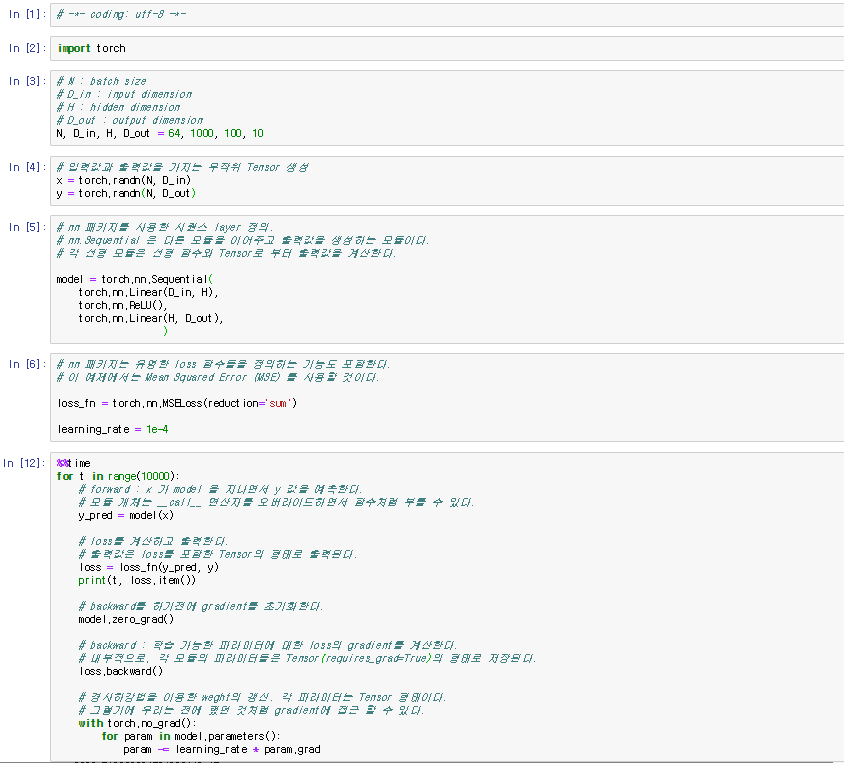 - torch.nn.Sequential 함수를 통해 모델을 구성하였다.