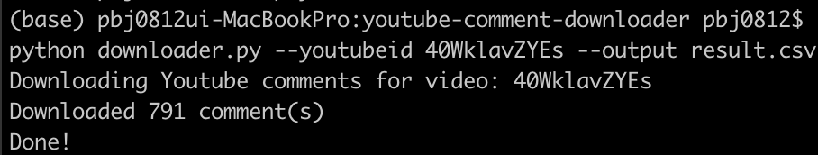python downloader.py --youtubeid 40WklavZYEs --output result.csv