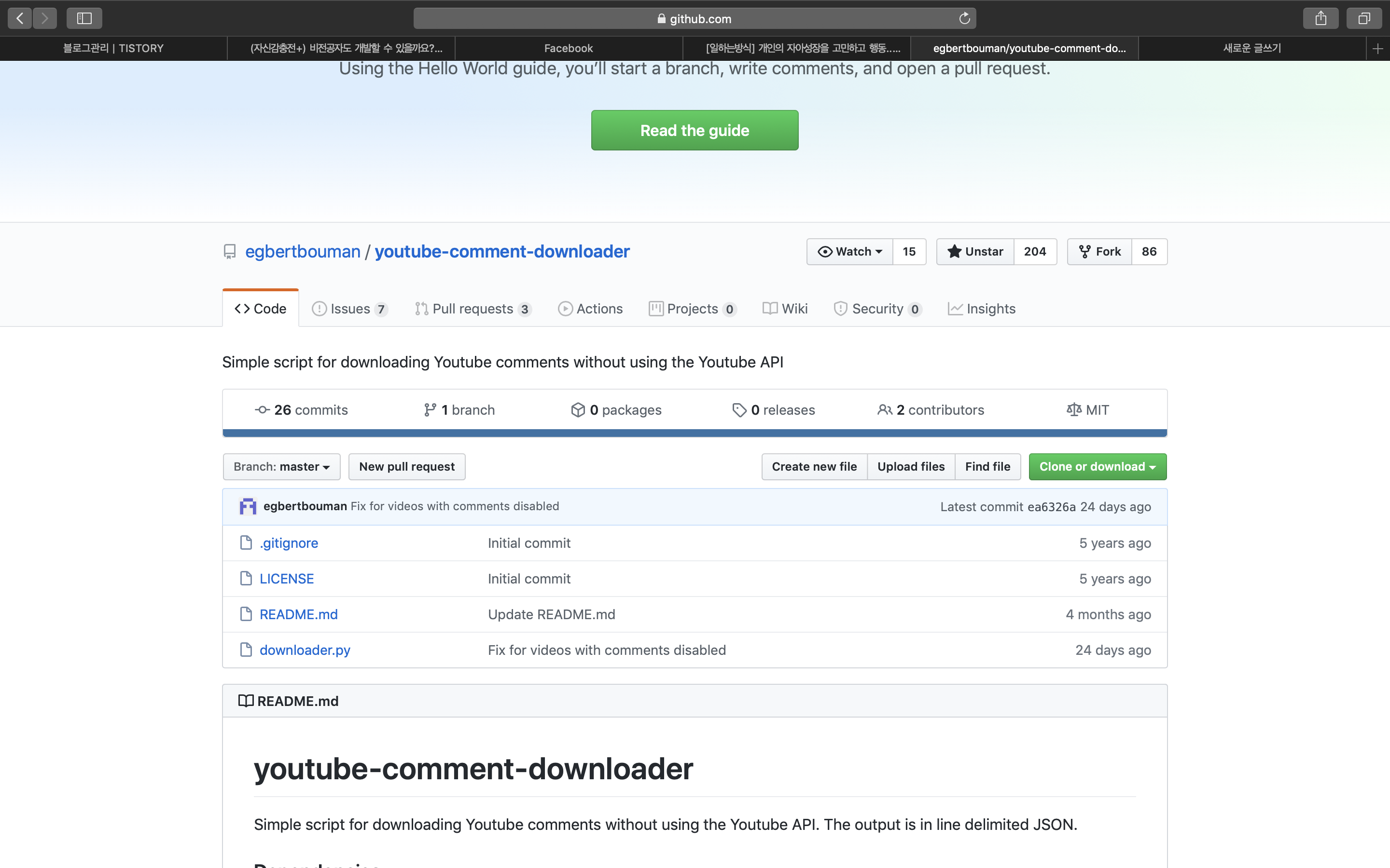 - git 사용자라면 git clone https://github.com/egbertbouman/youtube-comment-downloader.git 으로 다운로드