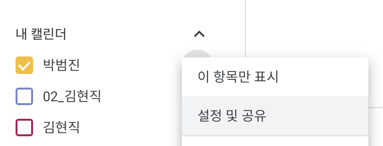 (1) 구글 캘린더 -> 좌측 -> 점 세개 -> 설정 및 공유