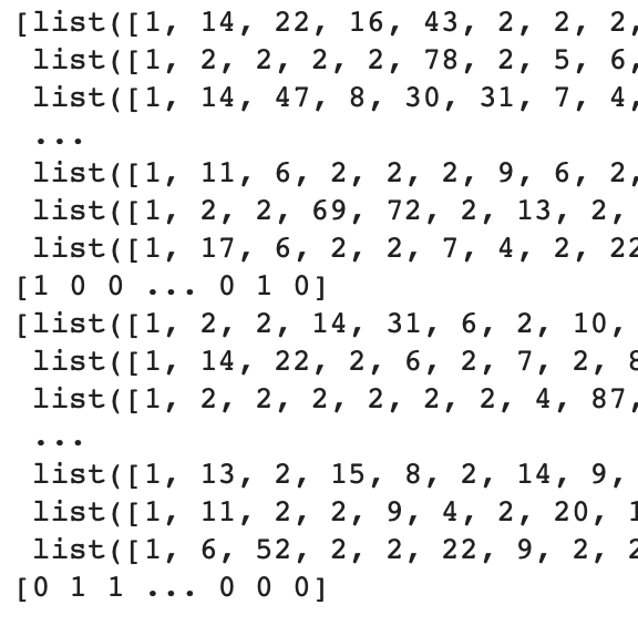 - 결과(x에는 리스트 형태의 숫자가 나열되어 있고, y에는 0, 1의 긍부정 결과가 존재)