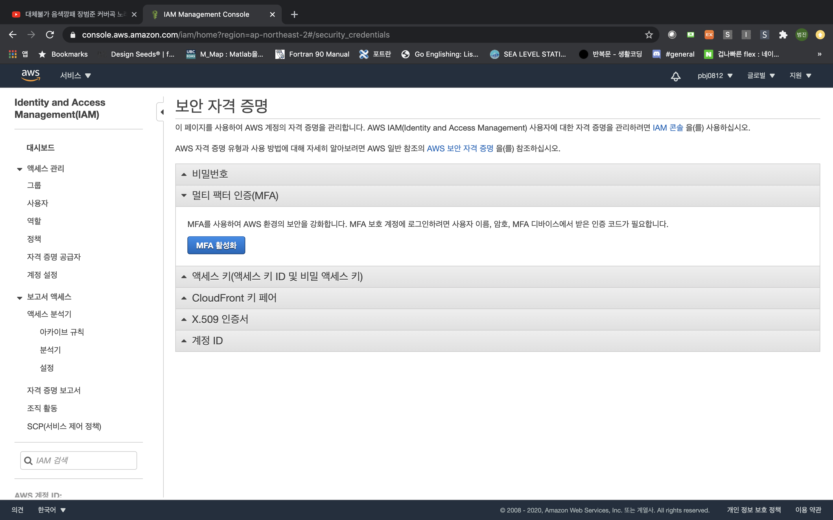 5) 멀티 팩터 인증(MFA) -> MFA 활성화 클릭
