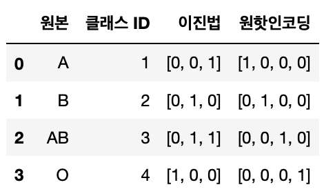 result = pd.DataFrame({'원본' : inp, '클래스 ID' : result_class_id, '이진법' : result_binary, '원핫인코딩' : result_one_hot})