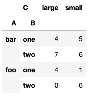 table = pd.pivot_table(df, values='D', index=['A', 'B'], columns=['C'], aggfunc=np.sum)