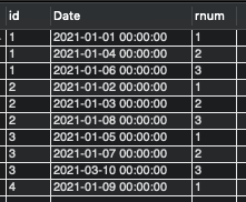 ROW_NUMBER() OVER(PARTITION BY id ORDER BY Date) AS rnum