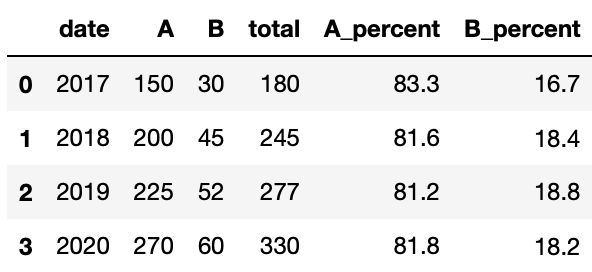 df = pd.DataFrame({'date' : ['2017', '2018', '2019', '2020'], 'A' : [150, 200, 225, 270], 'B' : [30, 45, 52, 60]})