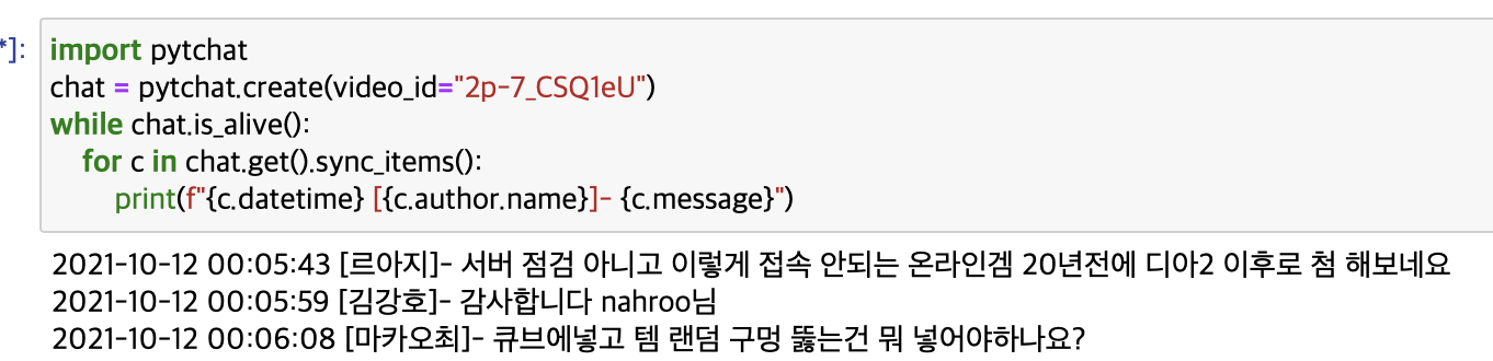 chat = pytchat.create(video_id="위에서 구한 video_id 입력")