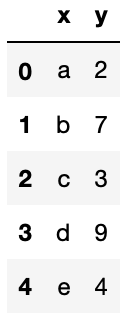 df = pd.DataFrame({'x' : ['a', 'b', 'c', 'd', 'e'], 'y' : [2, 7, 3, 9, 4]})