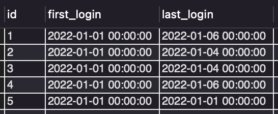 (1) 각 id 별 첫 번째 접속일과 마지막 접속일 연산