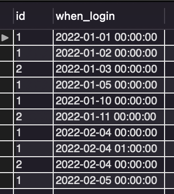 INSERT INTO sql_test.login_table(id, when_login) VALUES(1, '2022-02-05 00:00:00');