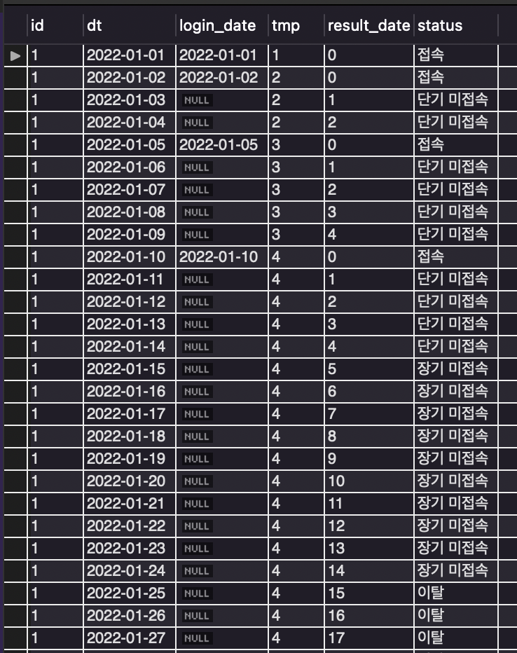 -- id 별로 날짜가 들어있는 데이터 세기(이때 접속일이 중간에 끊긴다면 해당 숫자가 계속 유지됨)
