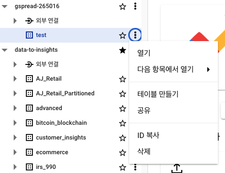 - 점 세개 찍힌 버튼(케밥 버튼) 클릭하여 데이터 세트 만들기 클릭(사진에서는 data-to-insights 버튼을 클릭했는데, 추가 권한이 없어 개인 프로젝트에다가 데이터 세트 구축)