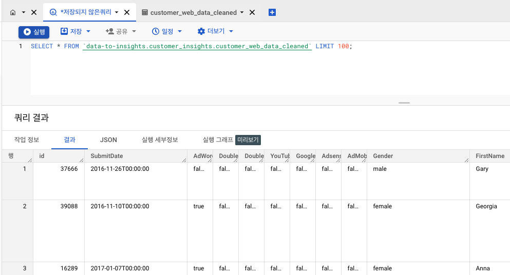 - 좌측에 보이는 것들이 테이블 관련 모음으로 프로젝트 > 데이터 세트 > 테이블의 구조로 이루어져 있으며, 가운데 부분이 쿼리를 칠 수 있는 부분