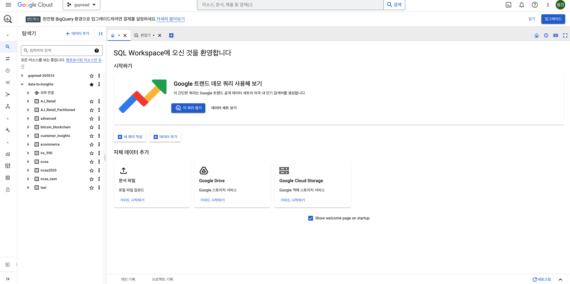- 적당히 채워 넣는다.(마찬가지로 여기서는 프로젝트 ID 가 data-to-insights 라고 적었지만 수정 권한이 없어 개인 프로젝트에 다시 만듬)