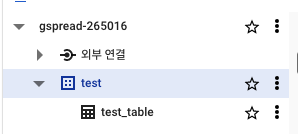 - 프로젝트에 test 데이터 세트가 생긴 것을 볼 수 있으며, 다시 하위 메뉴로 가면 테이블 만들수 있는 버튼이 생김. 클릭.