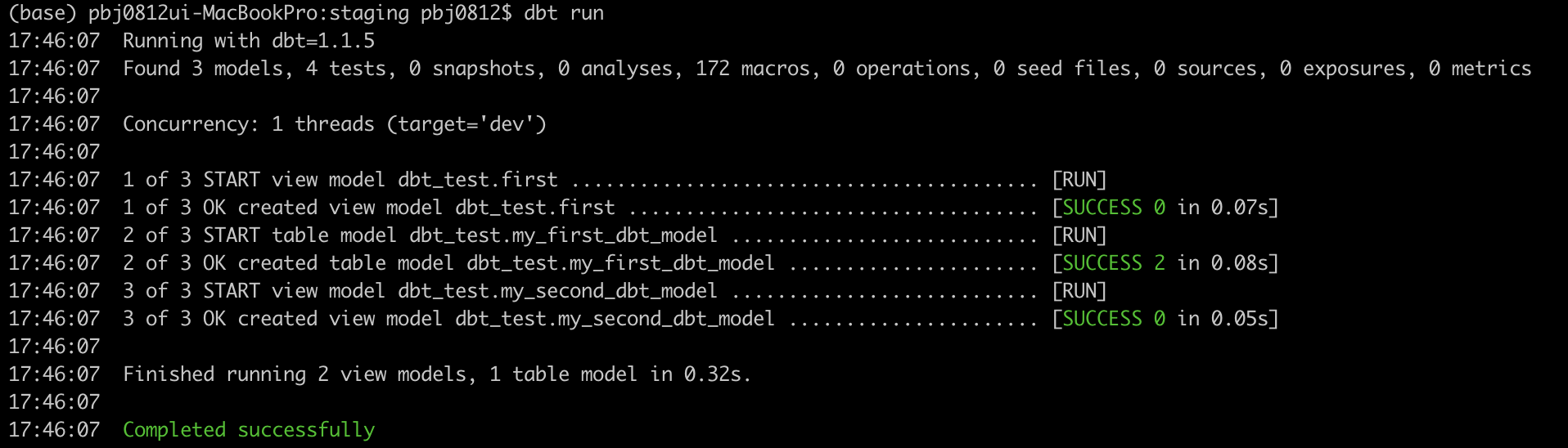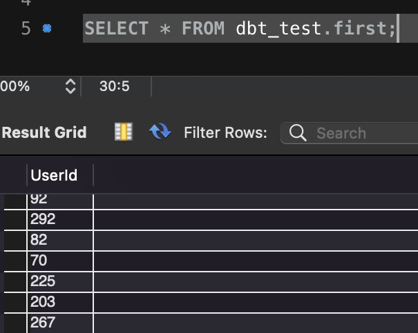 - 위의 project.yml 에서 스키마로 정의한 dbt_test 가 데이터 베이스 이름이 되었으며, Views 아래에 first.sql 파일의 이름은 first 가 그리고 필드는 UserId 만 가져온 것을 볼 수 있음