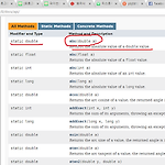 사용법은 http://docs.oracle.com/javase/8/docs/api/ 에 나와 있다. 기본적인 클래스는 java.lang 패키지에 포함되어 있다. 위 화면은 Math 클래스에 설명되어 포함되어 있는 메소드들을 나열한 것으로 메소드 이름과 호출시 방법, 인수, 설명 들이 적혀져 있다. 이를 활용한다면 보다 편하게 코드를 작성할 수 있으니 많은 메소드가 있다는 것을 아는 것이 좋다.